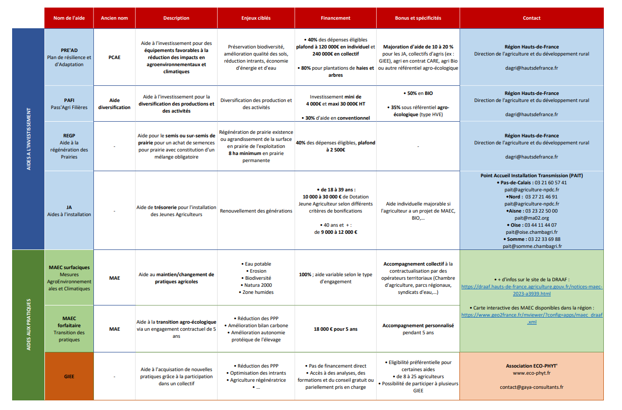 Résumé des principales aides à l’investissement ou aux pratiques