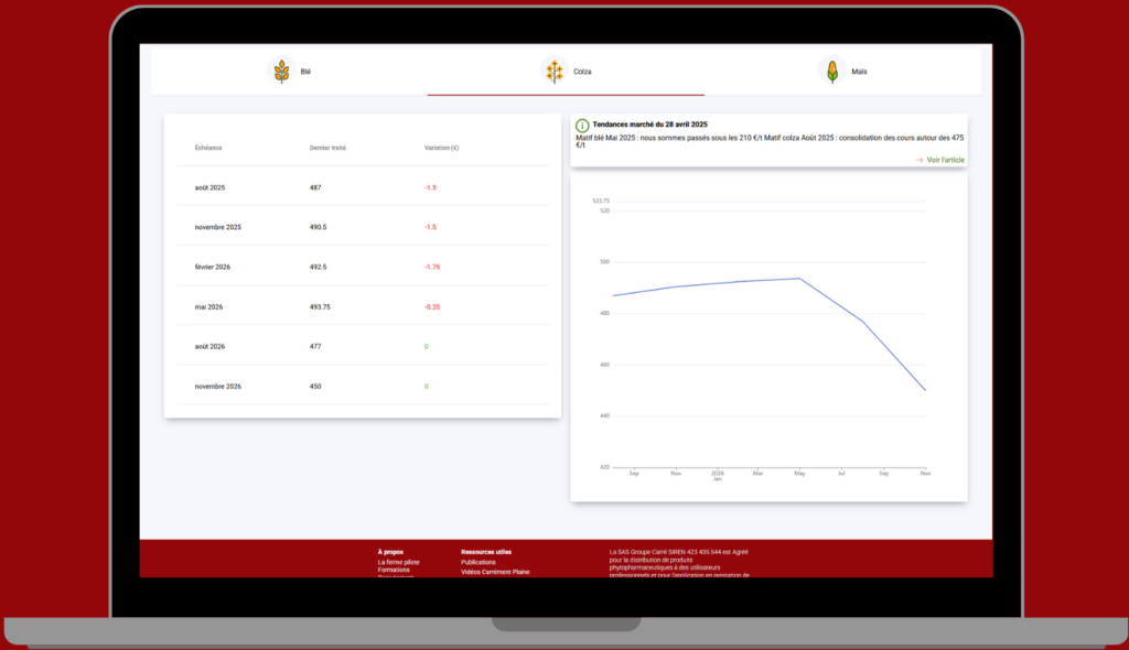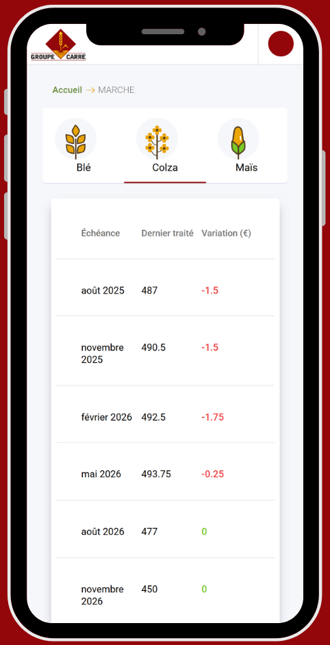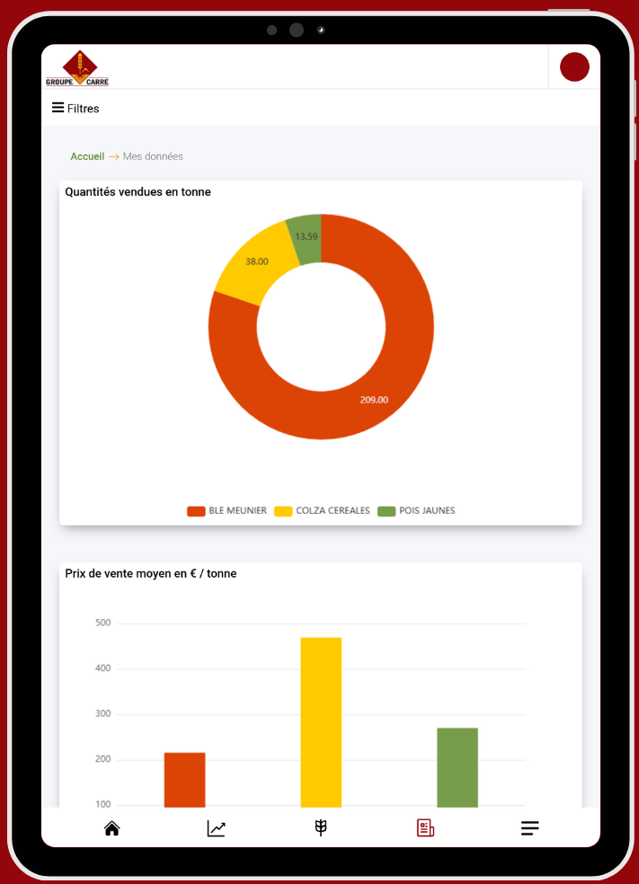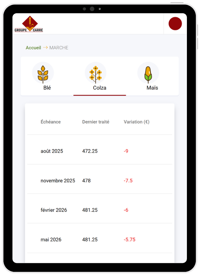Grâce à notre extranet, vous accédez en temps réel à l’ensemble des informations essentielles pour gérer votre exploitation. Suivez les cours des céréales en direct, retrouvez vos contrats, votre stock en dépôt et vos historiques de commercialisation. Le tout depuis un ordinateur ou smartphone.