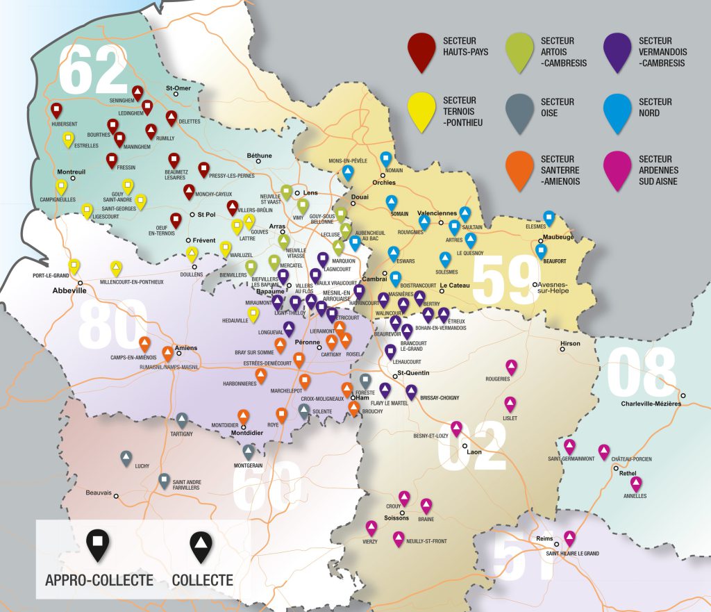 À l’origine, essentiellement concentrée sur le Nord-Pas-de-Calais, notre zone de collecte s’étend désormais vers le Grand-Est, l’Île-de-France et jusqu’en Bourgogne. Le Groupe compte aujourd’hui plus de 95 points de livraisons pour accueillir vos céréales : orge, blé, colza, pois, féveroles, maïs, tournesol.