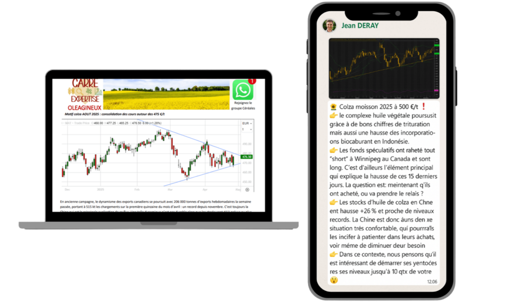Notre groupe WhatsApp vous permet de rester informé en temps réel de l’évolution des marchés agricoles. Vous y retrouverez des analyses claires sur le cours des céréales, les tendances du blé, du colza ou encore du maïs, ainsi que des commentaires techniques appuyés par des graphiques et des données à jour.